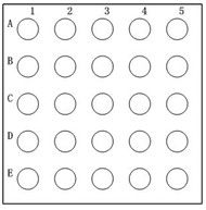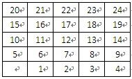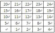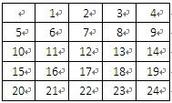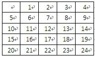 理线表是一张人为定义的表格,当使用24口配线架2可以使用5×5理线板,该理线表为5行5列的表格,每个单元格对应一个孔。理线表的填写方法可以有多种,每种填写方法对应于一种排列顺序。在右图中介绍了其中一种排列顺序(孔内数字代表配线架上的模块编号),它的特点是在配线架背后的每根线全部水平平行排列。