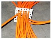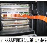 7) 托架理线:当理线板到达配线架背后的托架上后,先将线束绑扎在托架上,然后向前平移,每到达一个模块前时,将线束绑扎一次,然后分出该模块对应的线号。此工序应配备2人:1人分线,1人将线从配线架背后拉到配线架正面去(如果模块可以卸下,则将线从模块孔穿到正面去),同时2人唱号核对线号与配线架上的面板编号是否一致;