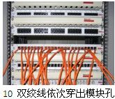 理线板穿线:在机房的进线口旁,将理线板按2所确定的方位将板的方向调整好,将水平双绞线按线号依理线表穿入理线板(有字的一面对着自己,线从无字的一面穿入板中),这道工序一般由两人共同完成:一人找到线号(只要找到该理线板所需的线号即可)并将其与其他线缆分离,一人将线穿入理线板的对应孔中。应该注意的是,双绞线应全部穿过理线板,也就是应该将理线板紧贴在进线口旁,这样才能保证进入机房的双绞线全部被整理;