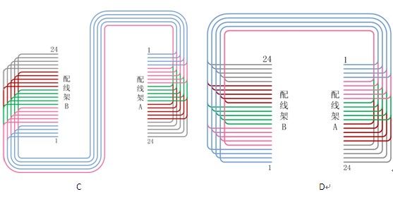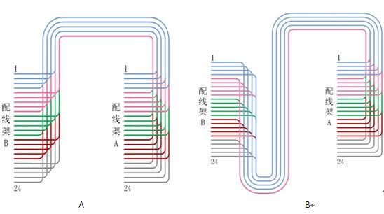 根据图示,在A配线架上双绞线的排列为1号线最先出现,其他线按顺序出线,排列整齐;在B配线架上仍然是1号线先出线,但因它排列在B配线架线束中4号线的位置,所以每层线在出线时会有交叉,由于五层线的交叉位置完全一致,所以在B配线架上不会影响美观。
